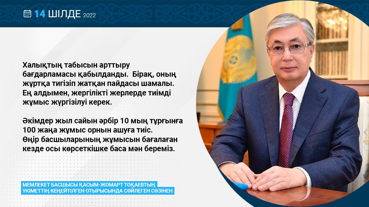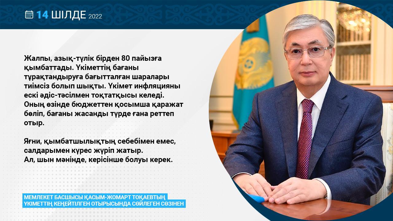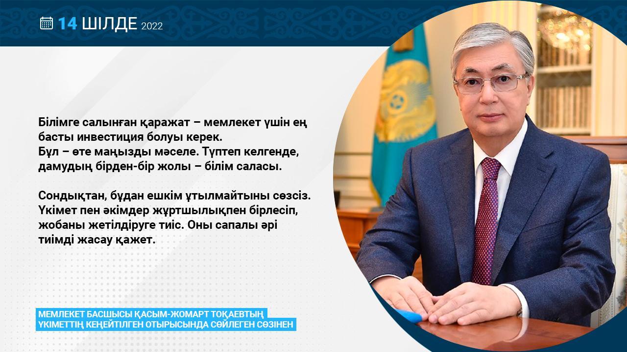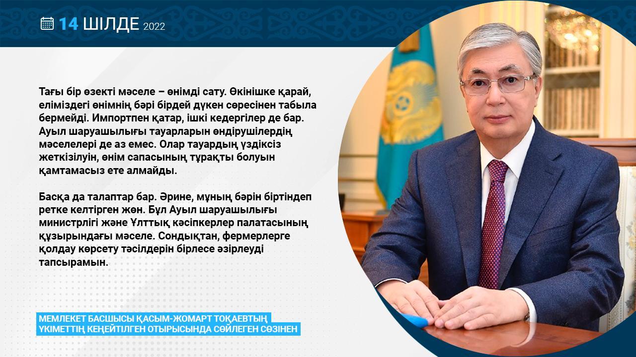 Мемлекет басшысы Қасым-Жомарт Тоқаевтың 2022 жылғы 14 шілдедегі Қазақстан Республикасы Үкіметінің кеңейтілген отырысында сөйлеген сөзінің маңызды тұстары.