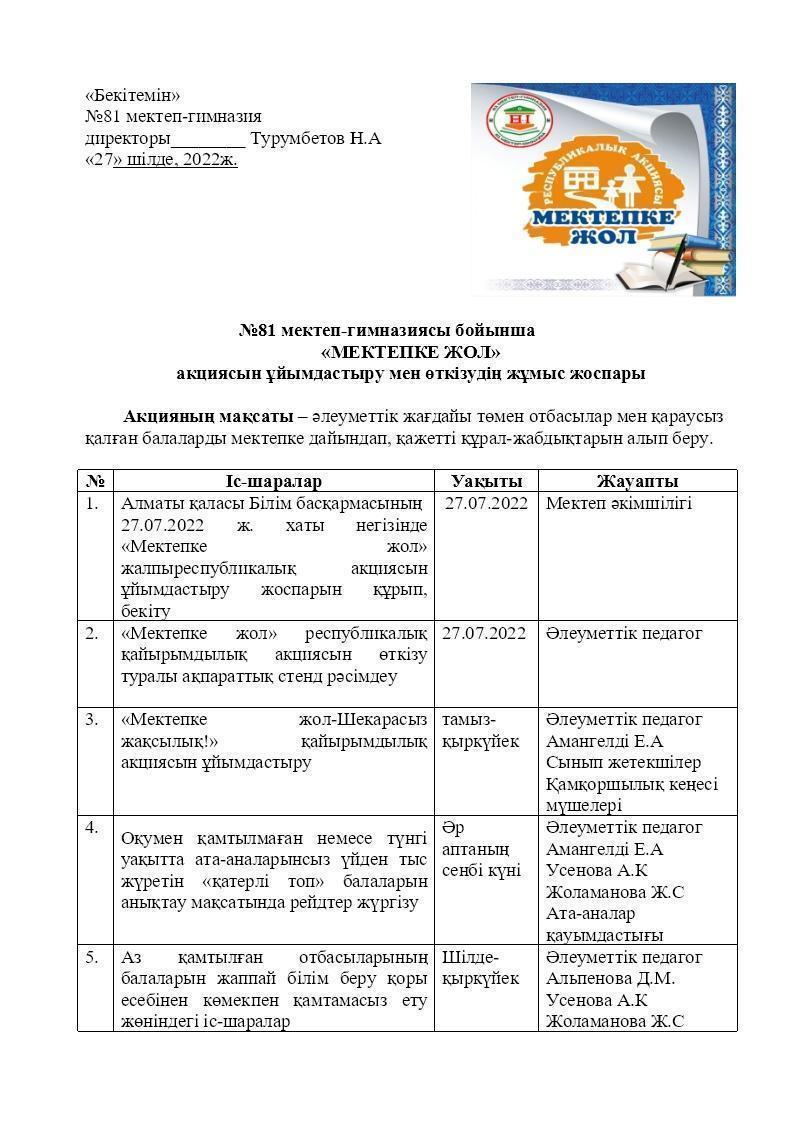 «МЕКТЕПКЕ ЖОЛ» акциясын ұйымдастыру мен өткізудің жұмыс жоспары
