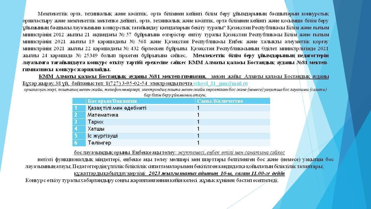 10 шілде 2023 0 1 2 3 4 5 Бос жұмыс орындары туралы Алматы қаласы Бостандық ауданы, № 81 мектеп-гимназиясы ENBEK.KZ электронды биржасына, әлеуметтік желі нысандарына мемлекеттік білім беру ұйымдары бос лауазымға тағайындауға конкурс жариялайды! Осы беттің QR-коды:QR-код этой страницы: