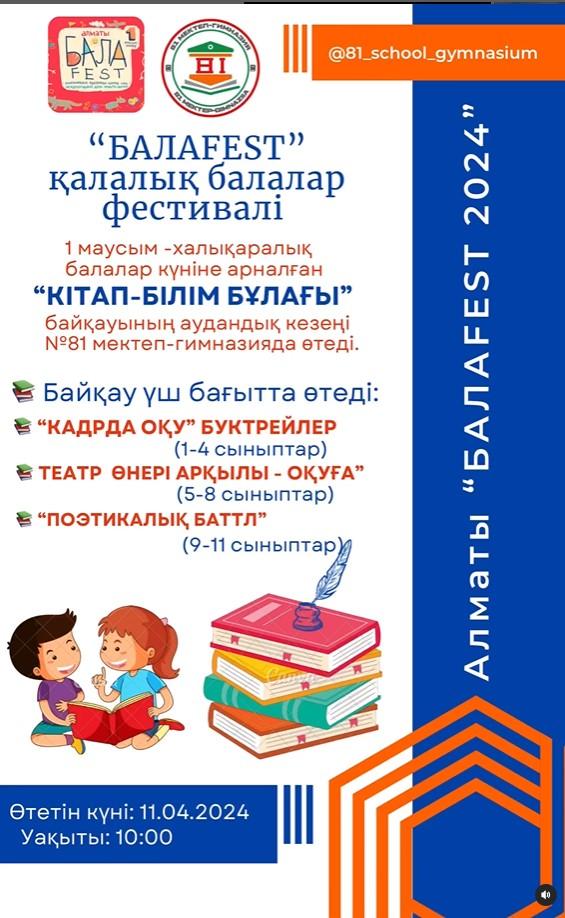 11.04.2024 күні, мектебімізде Халықаралық балалар күніне арналған “Балаfest” қалалық балалар фестивалі аясында “Кітап -білім бұлағы” тақырыбындағы байқаудың аудандық кезеңі өтеді.