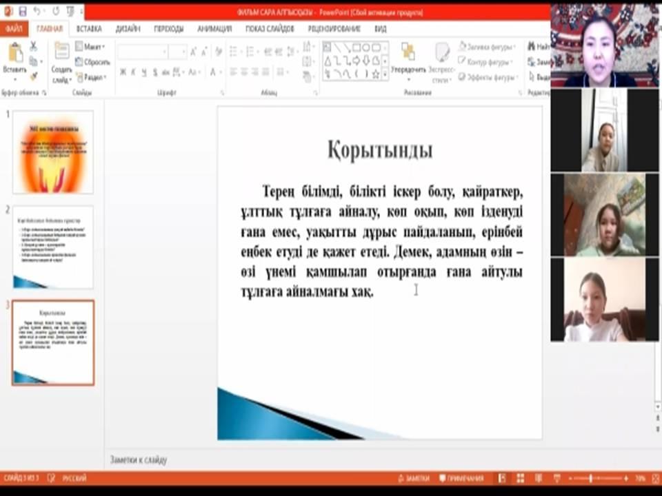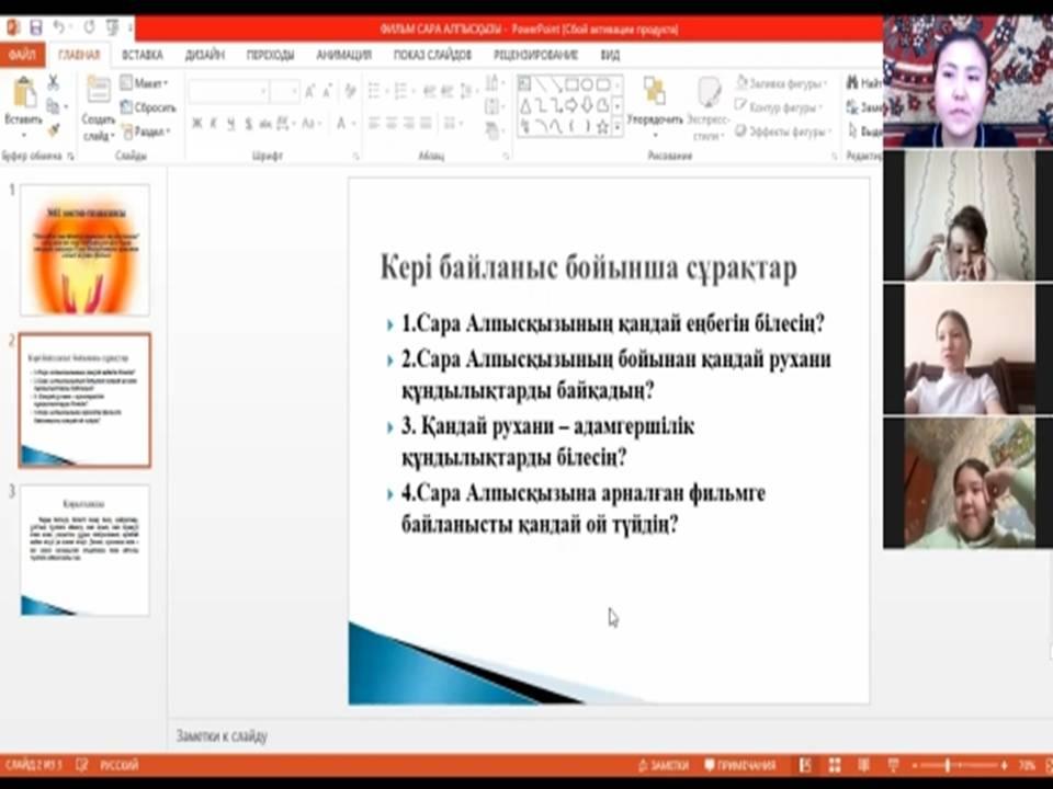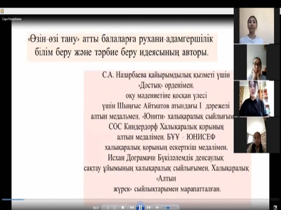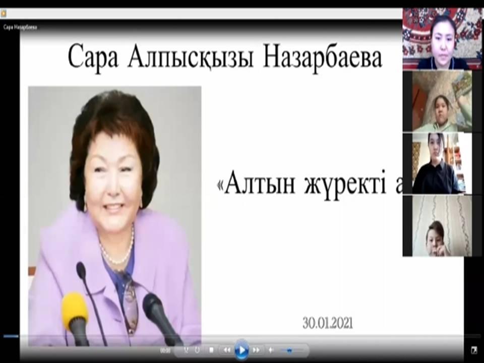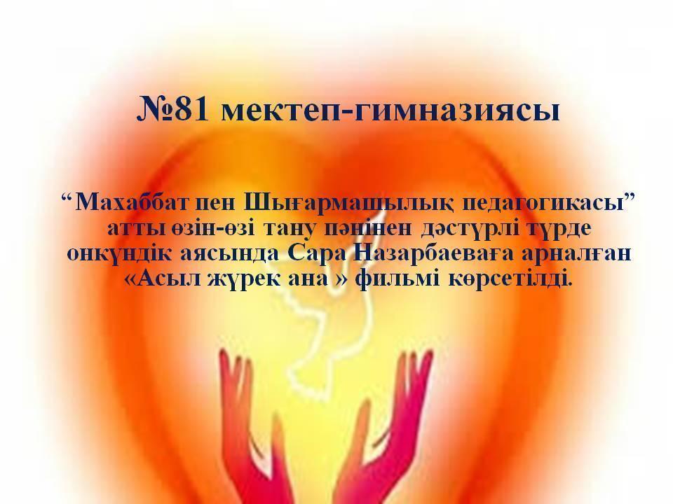 Бостандық ауданы, №81 мектеп-гимназиясында «Өзін – өзі тану» пәнінен «Өзін-өзі тану: Махаббат пен Шығармашылық педагогикасы» атты онкүндігі аясында 02.02.2021 күні «Өзін-өзі тану» рухани-адамгершілік білім беру бағдарламасының авторы Сара Алпысқызы Назарбаева туралы «Алтын жүректі ана» атты фильм көрсетілді.