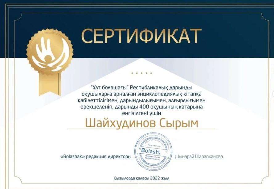 4 "Ә" сынып оқушысы Шайхудинов Сырым "Ұлт болашағы" республикалық дарынды оқушыларға арналған энциклопедиялық кітапқа дарындылығымен, қабілеттілігімен енді. Сынып жетекшісі: Ибраимова Г.К.