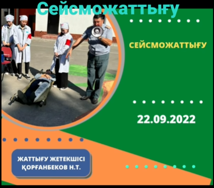 22.09.2022 күні, мектебімізде сейсможаттығу өтті. Сейсможаттығуда АӘД мұғалімі Н.Қорғанбеков төтенше жағдай кезіндегі ережелерімен таныстырып, сақтық шараларын түсіндірді. Мектептің көмек көрсетуші тобы жарақат алғандарға көрсетілетін алғашқы көмекті іс тәжірибе жүзінде көрсетті. Директордың оқу-тәрбие жөніндегі орынбасары Д. Альпенова