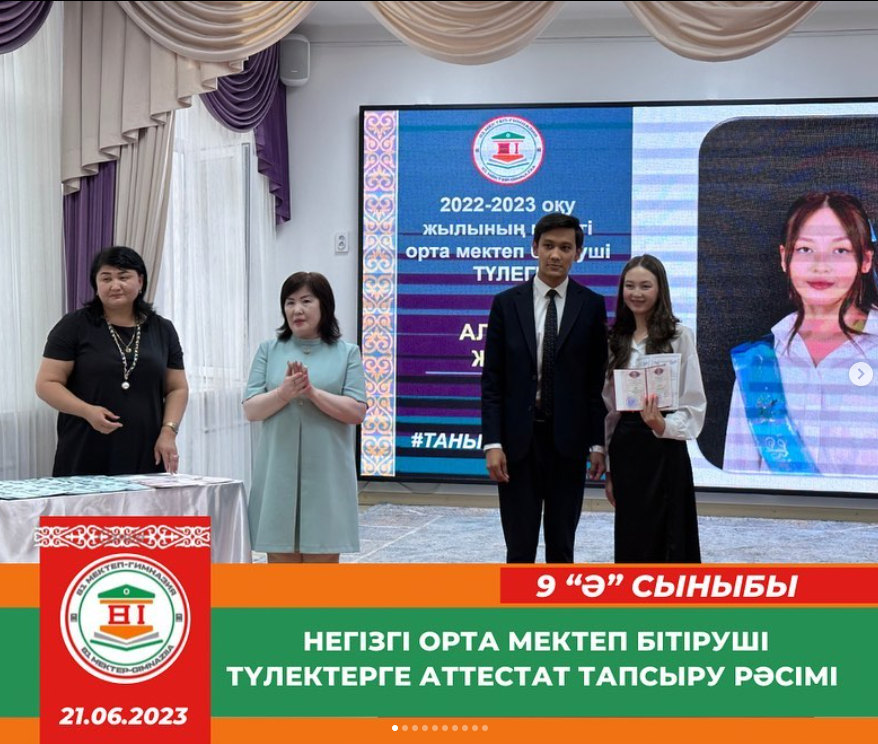 21.06.2023 күні, негізгі орта мектеп бітіруші, 9 “Ә” сынып оқушыларына салтанатты түрде Аттестат тапсырылды. Салтанатты рәсімге ата-аналар мен ұстаздар қатысты.