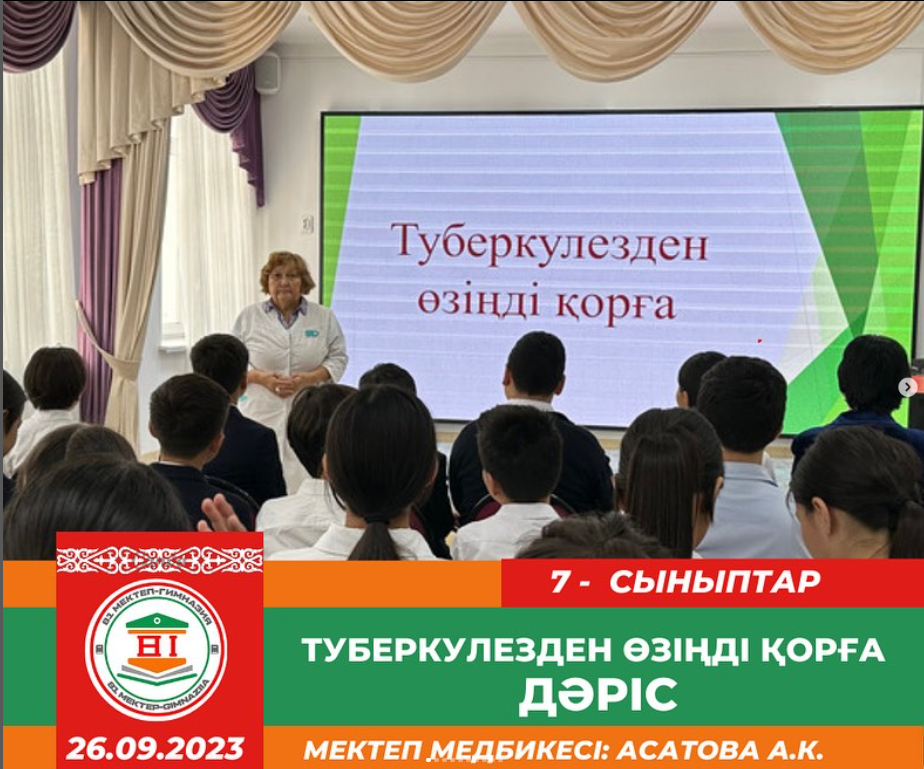 26.09.2023 күні, Туберкулездің алдын алу мақсатында «Өзіңді туберкулезден қорға!» тақырыбында 7-сыныптар арасында мектеп медбикесі А.Асатова мектеп әкімшілігінің қатысуымен дәріс өткізді.Дәріс барысында туберкулезге шалдығуға ықпал ететін факторлар: