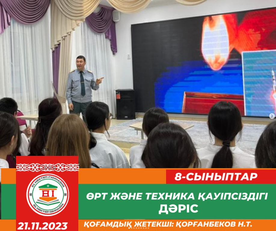 21.11.2023 күні, 8- сынып оқушыларымен өрт қауіпсіздігін алдын алу мақсатында “Өрт және техника қауіпсіздігі” тақырыбында қоғамдық жетекші: Н.Қорғанбеков дәріс өткізді. ДТІЖО :Ж.Жоламанова қатысты. Оқушыларға өрт қауіпсіздік құралдары таныстырылып, қауіптілік туындаған жағдайдағы қауіпсіздік ережелері түсіндірілді.
