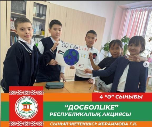 «ДосболLIKЕ» республикалық акциясы аясында 4 “Ә” сынып оқушылары “Достық “ тақырыбында сурет салып, қорғады. Достықтың белгісі бірлікте деп түсіндірді.