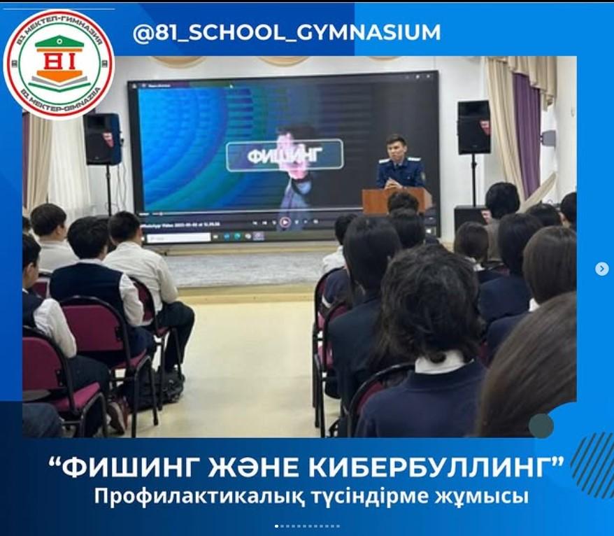 02.05.2025 күні, Бостандық ауданы прокуратурасының прокуроры Ратаев Дастан Амангельдиевич 6-7 сынып оқушыларына “Фишинг және кибербуллинг” тақырыбында профилактикалық дәріс жүргізді. Оқушыларға кибербуллинг пен фишинг туралы түсіндіре отырып, сақтану жолдарын айтты.