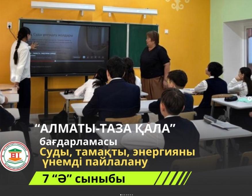 Сынып сағаты интерактивті түрде өткізіліп, бейнеролик көрсетілді, топтық талқылау ұйымдастырылды. Оқушылар экологиялық жауапкершілік туралы өз ойларын білдіріп, үйде және мектепте ресурс үнемдеу бойынша ұсыныстар жасады.