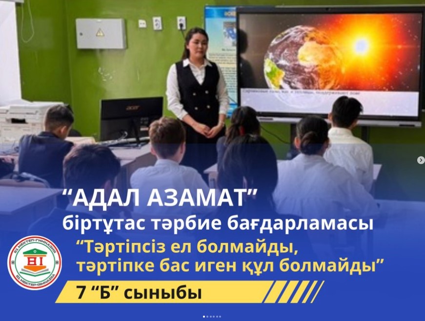 26.01.2026 күні, “Адал азамат” біртұтас тәрбие бағдарламасы аясында, 7 «Б» сыныбында. «Тәртіпсіз ел болмайды, тәртіпке бас иген құл болмайды» құндылығы негізінде сынып сағаты өткізілді. Сынып сағатының мақсаты – оқушыларға тәртіп пен жауапкершіліктің қоғамдағы маңызын түсіндіру, заң мен ережені сақтаудың азаматтық борыш екенін ұғындыру, отансүйгіштік пен саналы тәртіпке баулу.