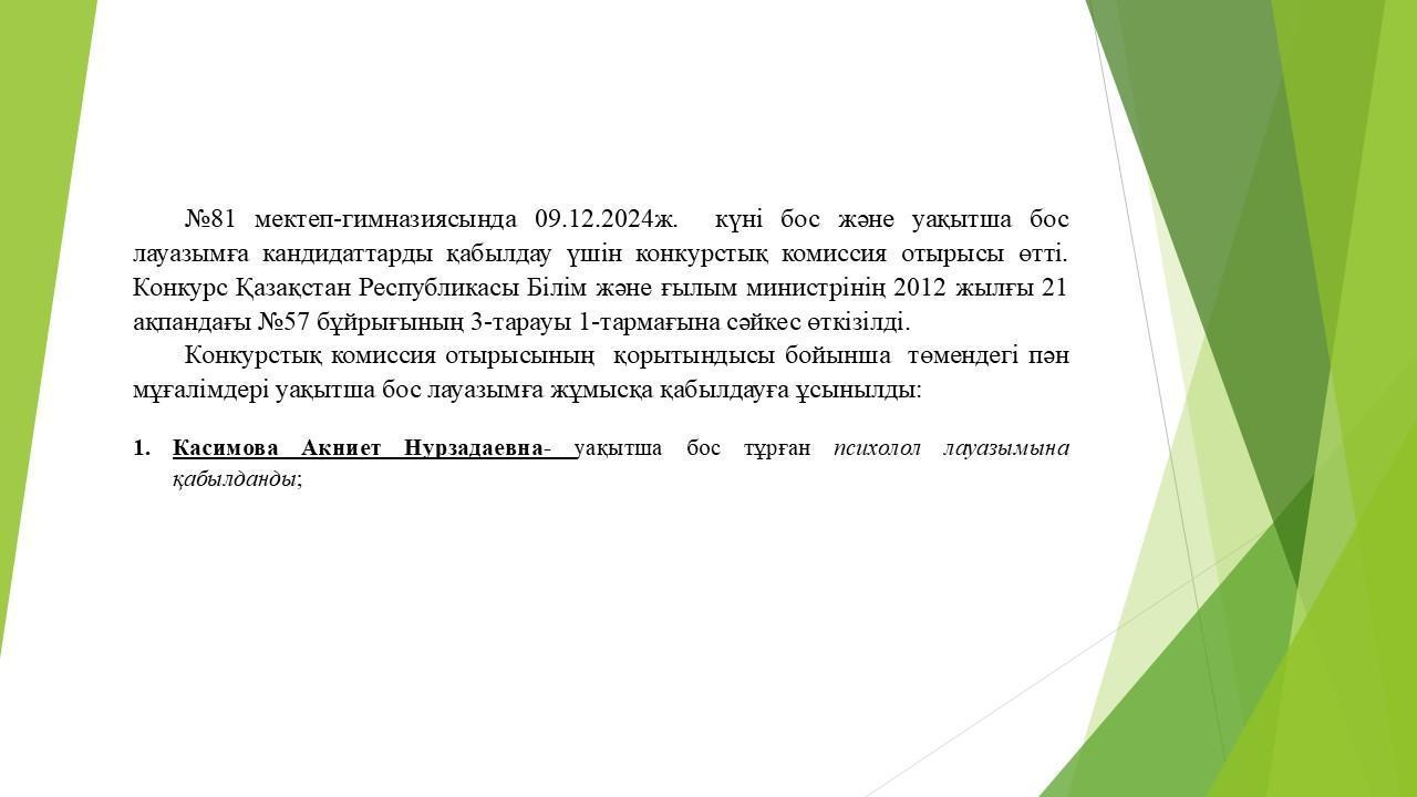 09 желтоқсан 2024 0 1 2 3 4 5 Уақытша бос лауазымға кандидаттарды қабылдау үшін конкурстық комиссия отырыс Уақытша бос лауазымға кандидаттарды қабылдау үшін конкурстық комиссия отырысы өтті. Осы беттің QR-коды:QR-код этой страницы: