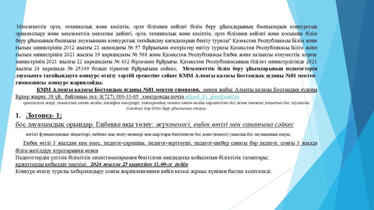 11 қыркүйек 2024 0 1 2 3 4 5 Бос лауазымға тағайындауға конкурс жариялайды! Бос лауазымға тағайындауға конкурс жариялайды! Осы беттің QR-коды:QR-код этой страницы: