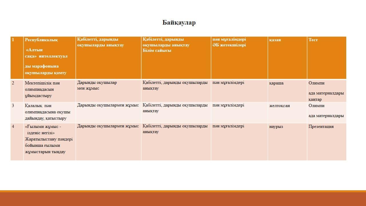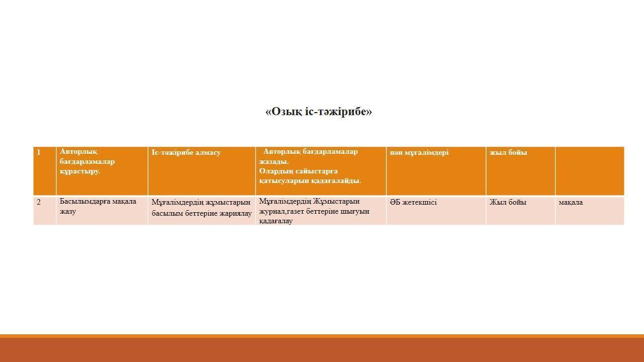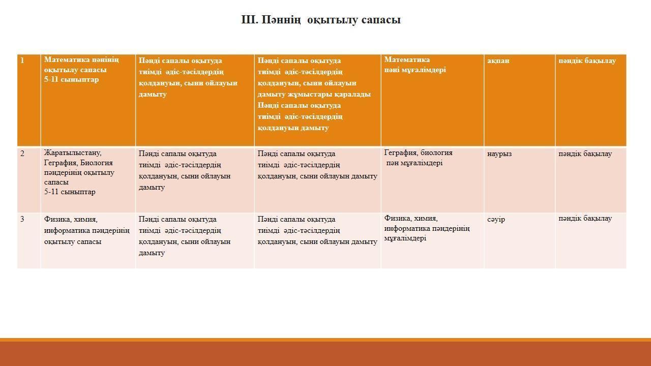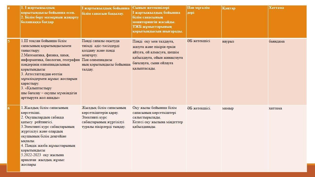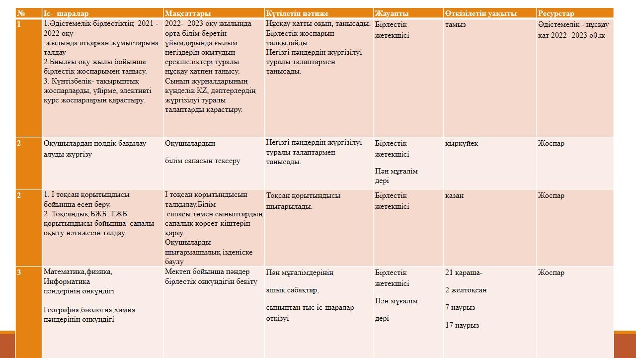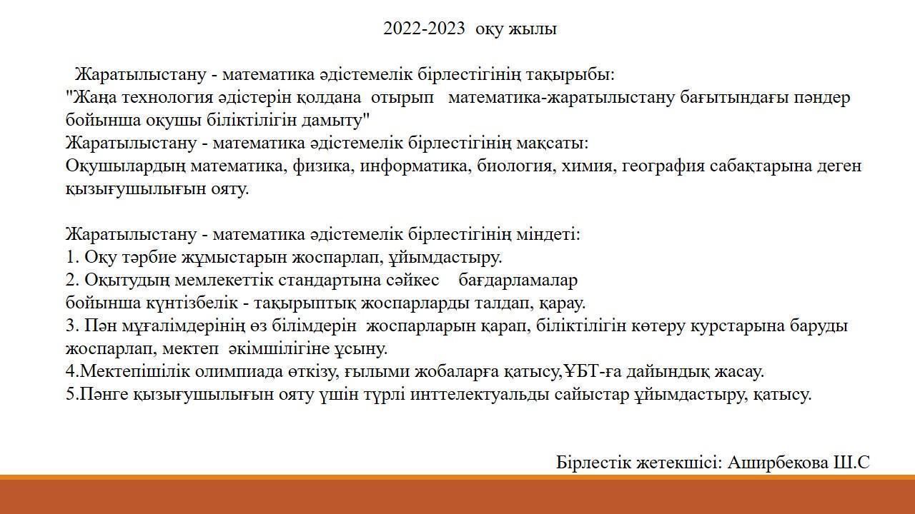 05 қыркүйек 2022 0 1 2 3 4 5 Жаратылыстану және математика пәндер кафедрасының 2022 – 2023 оқу жылында жүргізілетін жылдық жұмыс жоспары Жаратылыстану және математика пәндер кафедрасының 2022 – 2023 оқу жылында жүргізілетін жылдық жұмыс жоспары. Бірлестік жетекшісі: Аширбекова Ш.С Осы беттің QR-коды:QR-код этой страницы: