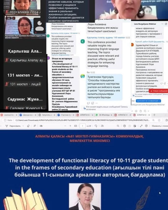 “Ағылшын тілінде тиімді әдіс-тәсілдерді қолдану -сапалы білім кепілі” тақырыбында ағылшын тілі мұғалімдерінің қалалық әдістемелік вебинарын өткізді #81 мектеп-гимназия ағылшын тілі пәнінің мұғалімдері: Нургалиева Л.А.,Садуақас Ж.Е. 15.03.25 күні, сағат 11:00 де.Вебинарға Турксиб,Алмалы, Медеу, Жетісу аудандарды ағылшын тілі мұғалімдері қатысты.