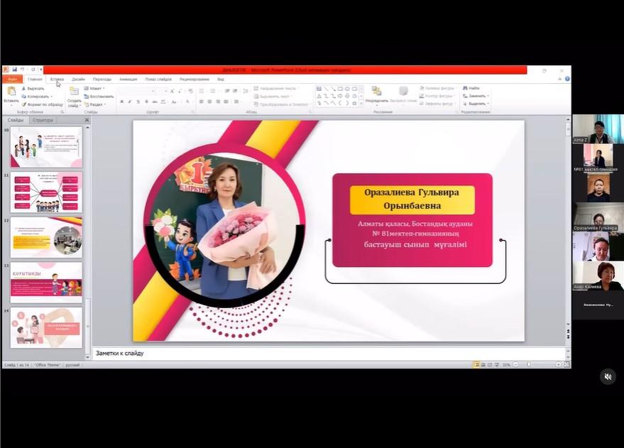 “Элективті курс бағдарламаларында тиімді әдіс- тәсілдерді қолдау - сапалы білім кепілі” тақырыбында бастауыш сынып мұғалімдерінің қалалық әдістемелік вебинары өткізілді. N81 мектеп-гимназияның бастауыш сынып мұғалімі Г.О.Оразалиева 4 сынып оқушыларына арналған “Диалогтік оқыту арқылы оқушылардың оқылым мен жазылым дағдыларын қалыптастыру”тақырыбында өз іс - тәжірибесімен бөлісті.