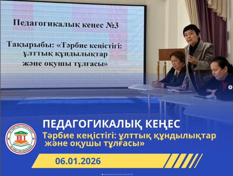 06.01.2026 күні, №3 Педагогикалық кеңес өтті. Тақырыбы: «Тәрбие кеңістігі: ұлттық құндылықтар және оқушы тұлғасы»