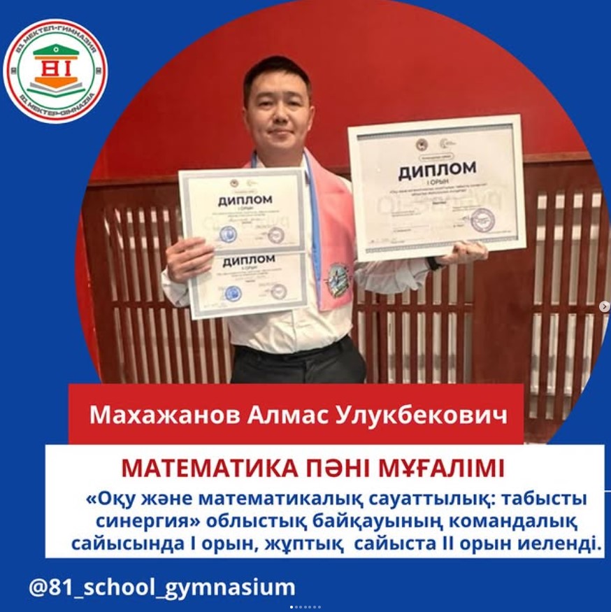 Алматы қаласы мұғалімдері арасында өткен «Ой сандық» зияткерлік сайысында Бостандық ауданы командасы құрамында қатысқан мектебіміздің математика пәні мұғалімі Махажанов Алмас Улукбековичті және жұптасы болған 215 мектеп ұстазы Нурадин Аружанды ерекше құттықтаймыз!