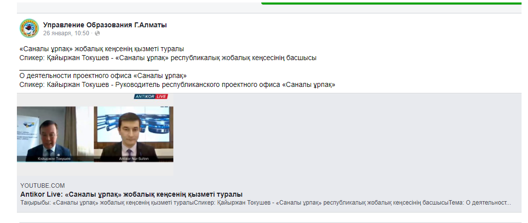 «Саналы ұрпақ» республикалық жобалық кеңсесінің басшысы Қайыржан Токушев мырзамен әлеуметтік желілерде «Саналы ұрпақ» республикалық жобалық кеңсесінің қызметі туралы сұхбат өтті.