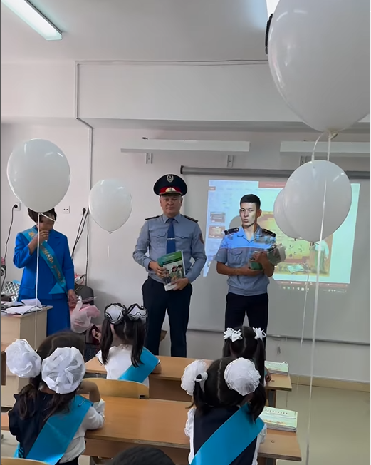 01.09.2023 күні, биыл мектеп табалдырығын аттаған 1- сынып оқушыларына сынып сағатында Полиция академия қызметкерлері жолда жүру ережесіне байланысты “Полиция және балалар” бояғыш журналын таратып, сыйға тартты.