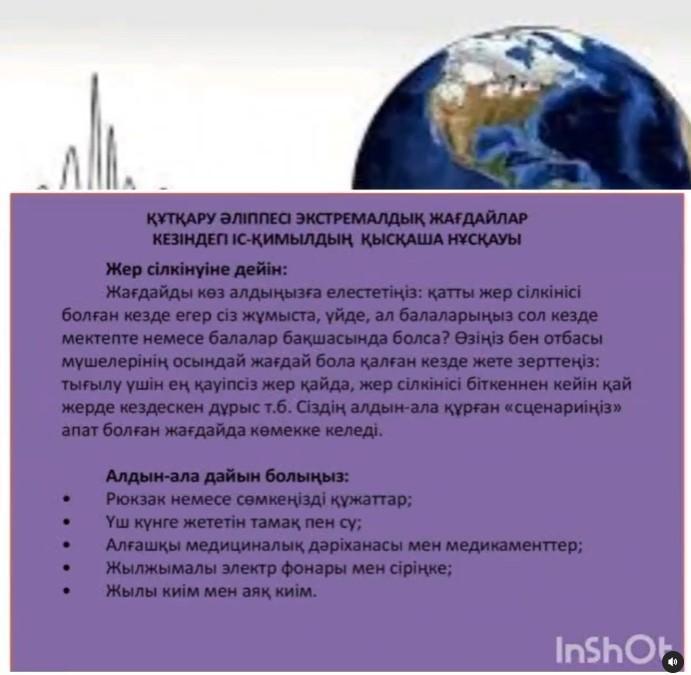 26.01.2024 күні, Алматы қаласы білім басқармасының «Алматы дарыны» дарынды балалар мен дарынды жастарды анықтау және қолдау орталығы мен ҚР ТЖМ Төтенше жағдайлар департаментері бірлескен «Объективте - «Қауіпсіздік» республикалық акциясы негізінде 3 “А” сынып оқушысы Темирбекова Динаның “Жер сілікінісі кезіндегі әрекеттер” тақырыбындағы бейнежазбасы.