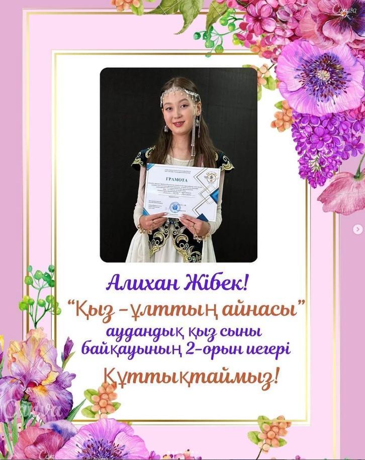 Айта кетер болсақ, мектебімізде өткен “Қазақ қызы әдемі” мектепшілік қыз сыны байқауына қатысып, бас жүлдені жеңіп, аудандық кезеңге жолдама алған аруымыз.