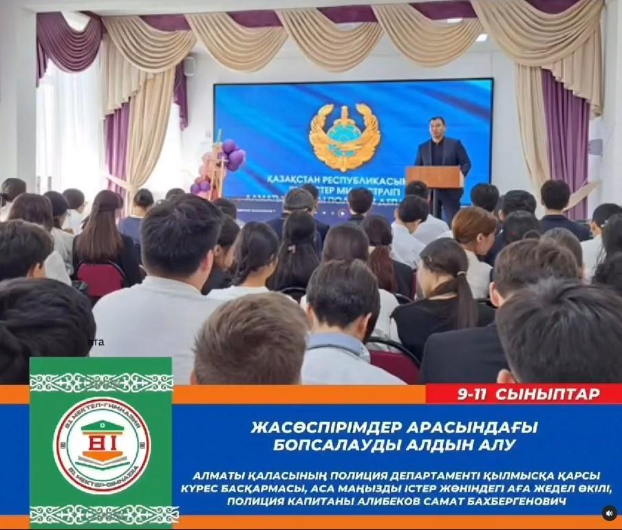 Алматы қаласының полиция Департаменті қылмысқа қарсы күрес басқармасы, аса маңызды істер жөніндегі аға жедел өкілі, полиция капитаны Алибеков Самат Бахбергенович 9-11 сынып оқушыларымен “Жасөспірімдер арасындағы бопсалауды алдын алу” тақырыбында дәріс оқыды.