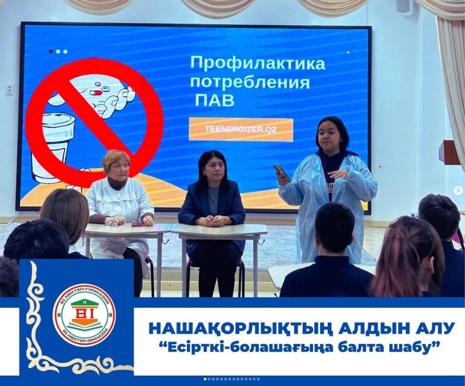 Осы жат қылықтан оқушыларымыздың алдын алу мақсатында дтіжо Усенова, мектеп медбикесі А.Асатова және дәрігер маман 9-10 сынып оқушыларымен “Есірткі - болашағыңа балта шабу” тақырыбында профилактикалық шара өткізді.
