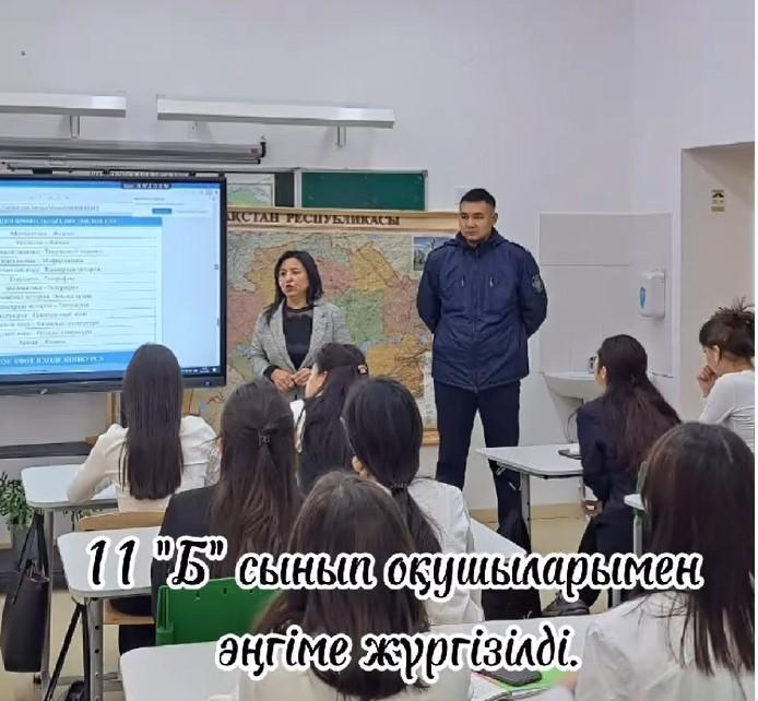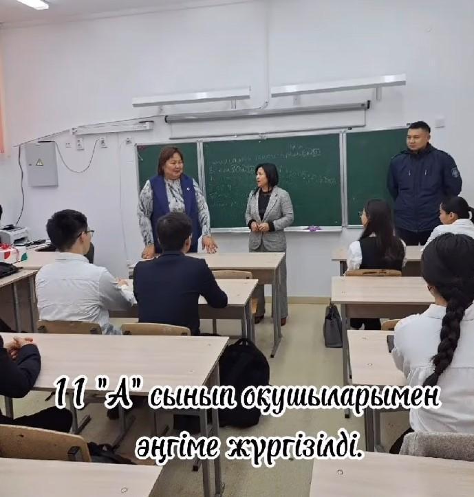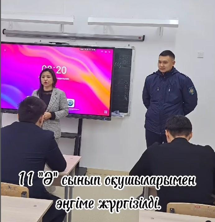 02.12.2024 күні Бостандық ауданы полиция басқармасының Ювеналдық полиция тобының Кәмелетке толмағандардың істері жөніндегі учаскелік полиция инспекторы, полиция аға лейтенанты Жотабай Бауыржан Тілеужанұлы және директордың тәрбие ісі жөніндегі орынбасары Жоламанова Жансая Садуакасовна 11 “А”, 11 “Ә”, 11 “Б” сынып оқушыларымен жасөспірімдер арасындағы құқықбұзушылықтың алдын алуға байланысты “Балалар арасындағы тұрмыстық зорлық-зомбылықтың алдын алу” тақырыбында профилактикалық әңгіме жүргізді.