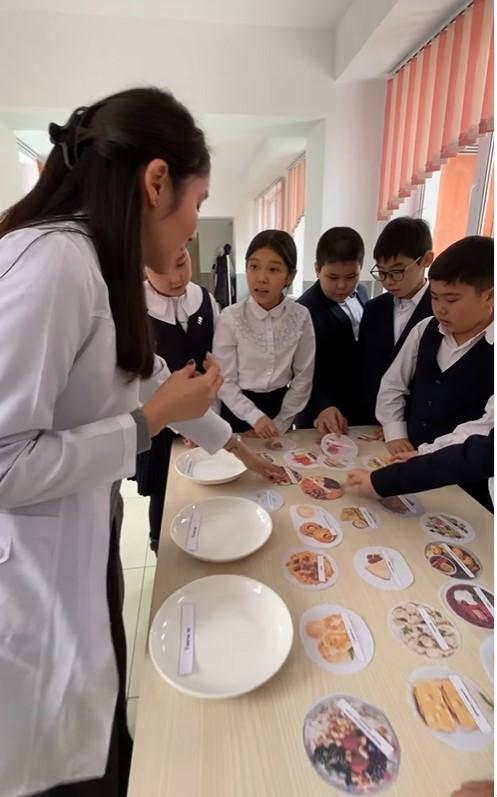 Биология пәні мұғалімі Г.Нигметжанова 4- сынып оқкшыларымен “Дұрыс тамақтану ережелері” тақырыбында практикалық шара өткізді.