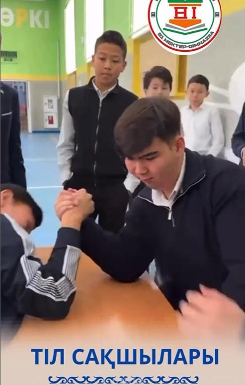 “Біртұтас тәрбие” бағдарламасы мен “Тіл сақшылары” жобасы аясында оқушылар қоңырау уақытын тиімді пайдаланып, ұлттық ойын қол күресте күш сынады. Мақсаты: ұлттық құндылықтарымыз бен ұлттық ойындарымызды насихаттау.