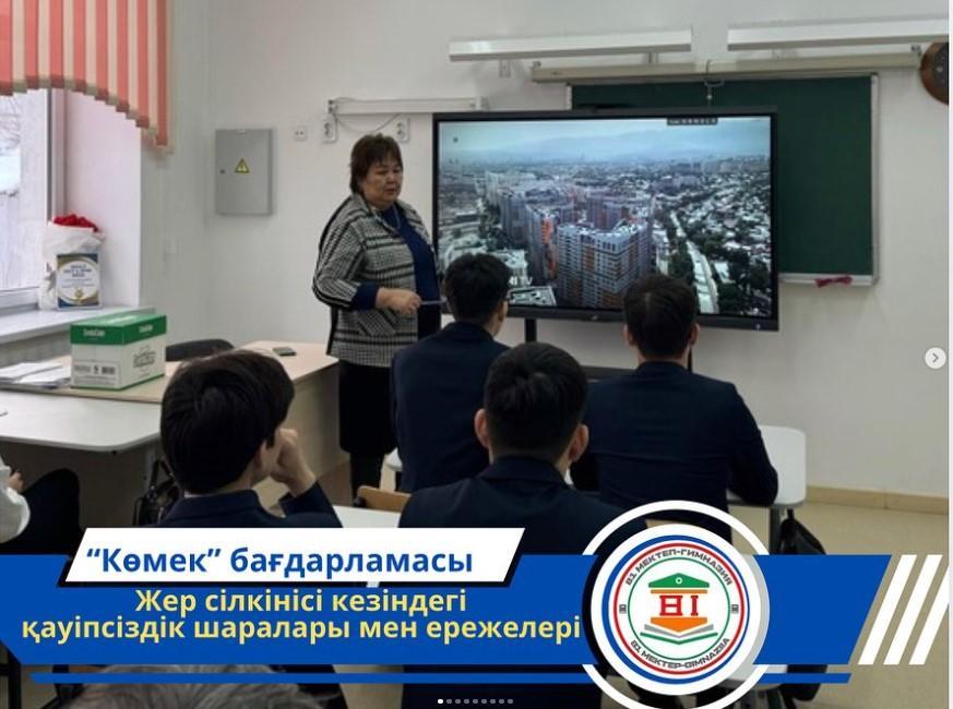 “Қөмек бағдарламасы” аясында қауіпсіздік минутында оқушылардың өмір қауіпсіздігін алдын алу мақсатында “Жер сілкінісі кезіндегі шаралар мен ережелер” тақырыбында сынып сағаты өтті.