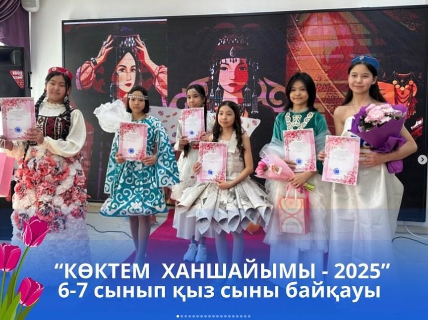 05.03.2025 күні, 8-наурыз Халықаралық әйелдер мерекесіне байланысты 6-7 сынып қыз балалары арасында «Көктем ханшайымы» қыз сыны байқауы өтті. Байқауда 6-7 сыныптардан 6 ару бақ таластырды.