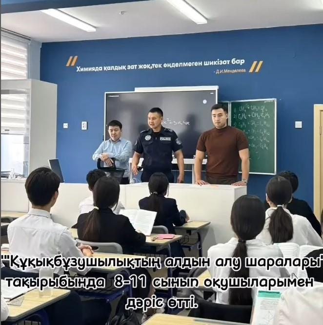 №81 мектеп-гимназиясы бойынша КПБ аға жедел уәкілі, полиция капитаны Жумабай Шерхан Кайратұлы, Бостандық АПБ ЖПҚБ ЮПБ КТІЖ Учаскелік полиция инспекторы, полиция аға лейтенанты Б.Т.Жотабай директордың тәрбие ісі жөніндегі орынбасары Ж.Жоламанованың қатысуымен «Құқықбұзушылықтың алдын алу шаралары» тақырыбында 8-11 сынып оқушыларына әңгіме жүргізді.