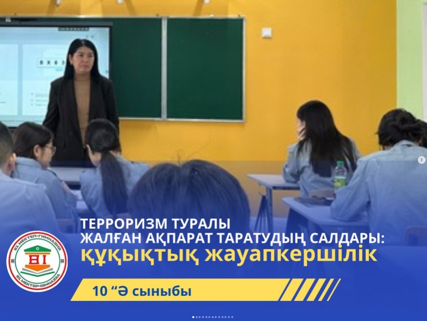 20.01.2025 күні, ДТІЖО А.Усенова 10 “Ә” сыныбына Алматы Білім басқармасының 19.01.2026 күнгі хаты негізінде №48.1-К Терористік сипаттағы құқықбұзушлықтардыңиалдын алу, сондай-ақ тероризм актісі туралы жалған хабарламаларды таратудың алдын алу мақсатында ҚР қылмыстық кодексінің 273 бабымен таныстырып, Алматы қаласы бойынша Ұлттық қауіпсіздік комитеті Департаменті тарапынан