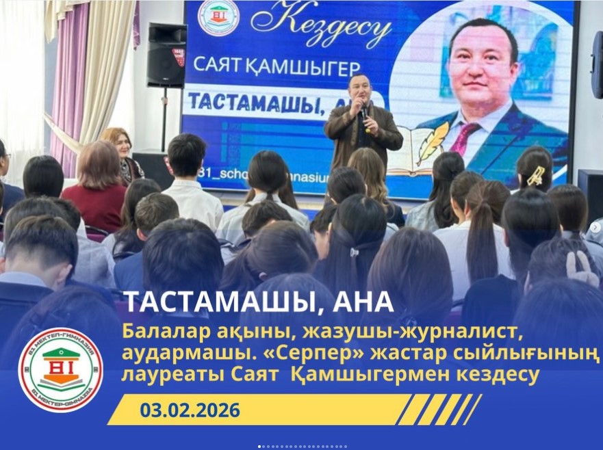 03.02.2026 күні, мектебімізде Қазақстан Жазушылар одағы басқармасының әдеби кеңесшісі, ақын, «Серпер» жастар сыйлығының иегері, ақын, аудармашы, балалар жазушысы, журналист Саят Қамшыгермен және ақын, журналист, Башқұртстанның Халық ақыны, Башқұртстан Жазушылар одағы Балалар әдебиеті кеңесінің басшысы, республикалық “Ақбозат” журналының бас редакторы Лариса Абдуллинамен әсерлі кездесу өтті. Кездесу “Тастамашы, Ана!” тақырыбында өтті. Тағылымы терең кездесуден балалар ата-ананың қадірі туралы, оларға деген сүйіспеншілік пен құрмет жайында әңгіме өрбіді. Кездесу барысында балаларға тәрбиелік мәні зор ой-пікірлер ұсынылып, рухани құндылықтарды бағалауға бағыт берілді.
