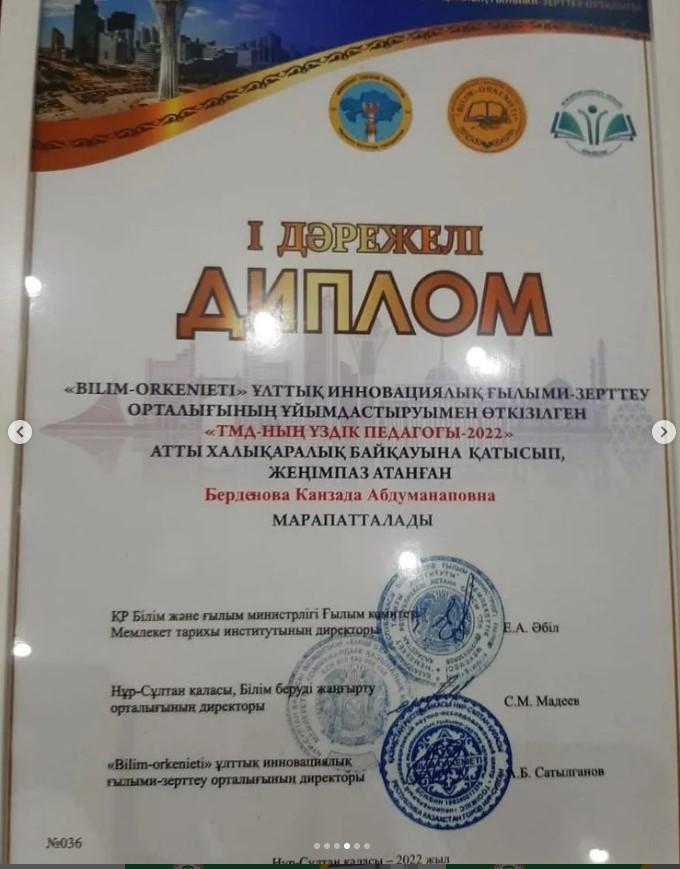 "BILIM ORKENIETI" ұлттық инновациялық ғылыми-зерттеу орталығының ұйымдастырылуымен өткізілген "ТМД-ның Үздік педагогі-2022" атты халықаралық байқауына қатысып, жеңімпаз атанған қазақ тілі мен қазақ әдебиеті мұғалімі К.Берденова ҚР Білім және Ғылым министрлігі Ғылым комитет Мемлекет тарихы институтының І дәрежелі дипломымен Нұр-Сұлтан қаласында марапатталды. Ұстазымызды жеңісімен құттықтаймыз🇰🇿👍👏