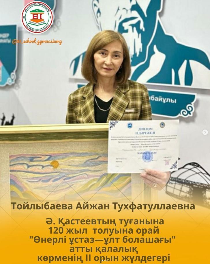 Алматы қаласы Білім басқармасының Қалалық білім берудегі жаңа технологиялардың ғылыми-әдістемелік отталығы мен қалалық көркем еңбек және бейнелеу өнері пәндерінің Ассоциациясы бірлесуімен ұйымдастырылған Ә. Қастеевтың туғанына 120 жыл толуына орай “Өнерлі ұстаз—ұлт болашағы” атты ұстаздар арасындағы қалалық көрменің ІІ орын жүлдегері көркем еңбек пәнінің мұғалімі Тойлыбаева Айжан Туфатуллақызын құттықтаймыз. Еңбегіңіз жемісті болсын!