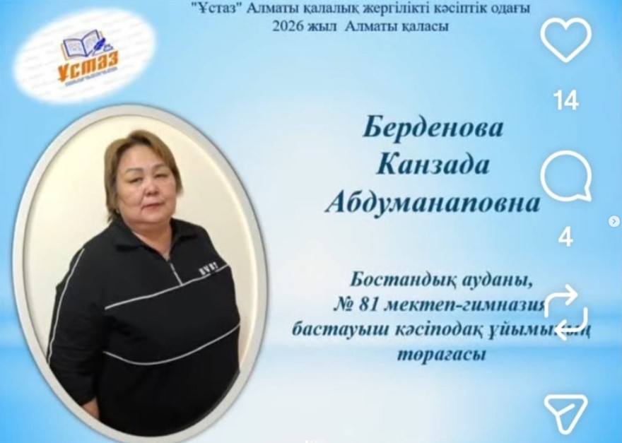 Қалалық “ҰСТАЗ”кәсіподақ ұйымының ұйымдастыруымен өткен 2025 жылдың қорытындысы бойынша жоғары нәтиже көрсеткені және тиімді жұмысы үшін № 81 мектеп-гимназияның кәсіподақ ұйымының төрайымы, қазақ тілі мен әдебиеті пәнінің мұғалімі Берденова Канзада Абдуманаповна марапатталды.