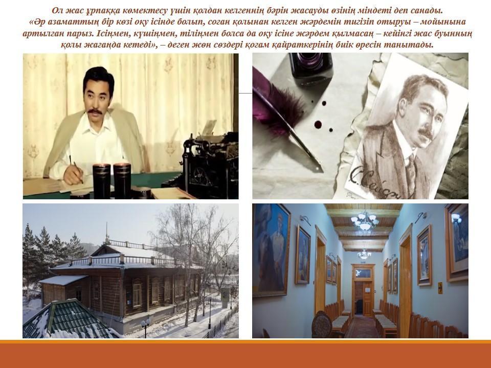 Сәкен Сейфуллин – мемлекет және саяси қайраткер, ақын және жазушы, қазіргі қазақ әдебиетінің негізін қалаушылардың бірі. Ол қазақ халқының жандануы мен өркендеуі үшін өз өмірін қиған қазақ қайраткерлерінің тобына жатады.