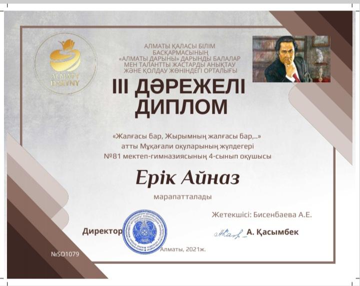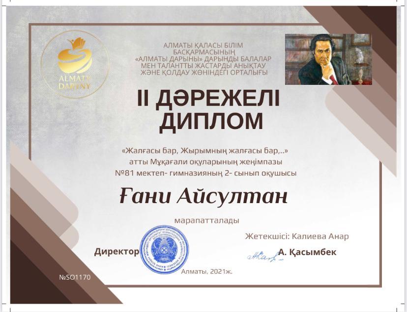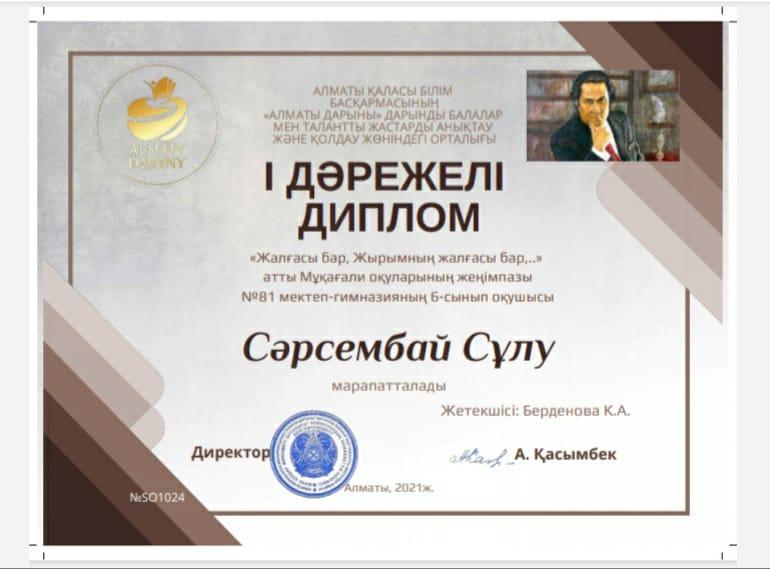 Алматы қаласы Білім басқармасы "Алматы дарыны" дарынды балаларды қолдау мен анықтау орталығының ұйымдастыруымен Мұқағали Мақатаевтың 90 жылдығына арналған "Жалғасы бар, жырымның жалғасы бар..." атты Мұқағали оқуларының жеңімпаздары мен жүлдегерлері «Алматы дарыны» орталығының I, II, III дәрежелі дипломдарымен марапатталады. 1 және 2 орын жүлдегерлері республикалық кезеңге жолдама алды. Жолдама алған оқушыларымызға алдағы жауапты кезеңнен сүрінбей өтіп мектеп мәртебесін көтере берулеріне тілек білдіреміз. Тек қана алға, әрқашан алда бол!