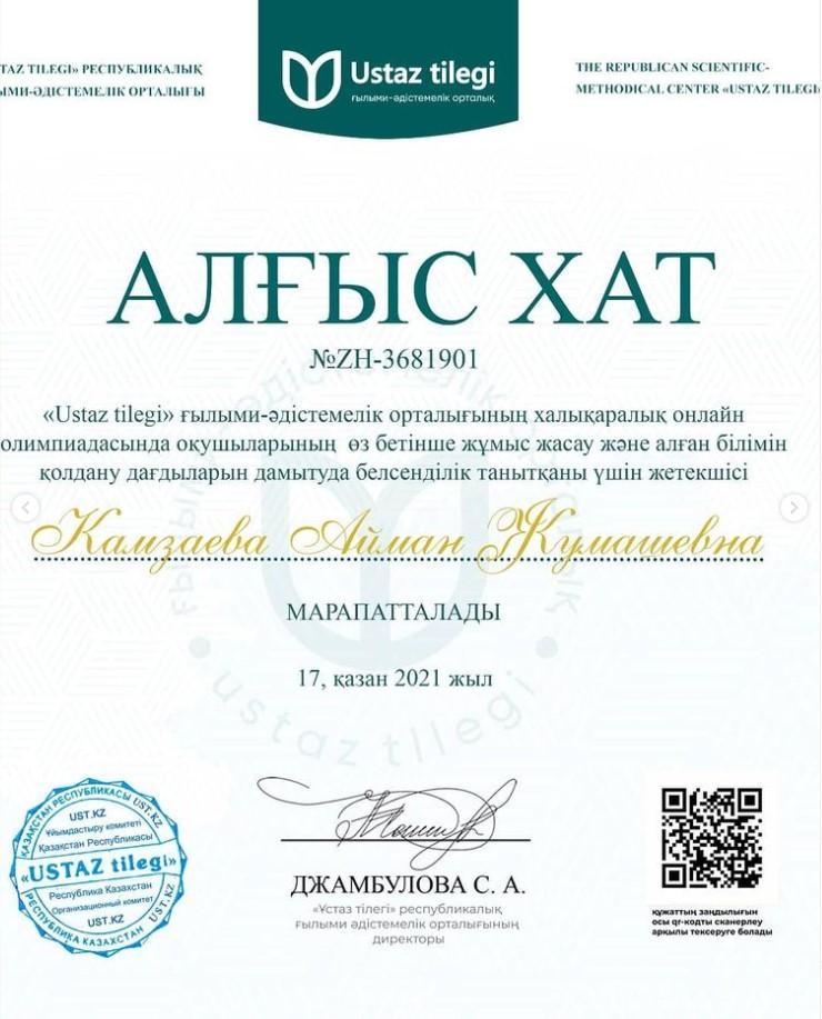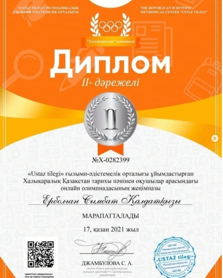 8 "А" сынып оқушысы Омарғазы Ерзат, Қадырханұлы Дарын, 11 "А" сынып оқушысы Ерболған Сымбат "Ustaz tіlegi" ғылыми-әдістемелік орталығы ұйымдастырған Республикалық Қазақстан тарихы пәнінен оқyшылар арасындағы онлайн олимпиадасының І орын иегерлері атанды. Оқушыларымызды жеңісімен құттықтаймыз. Олимпиадаға қатыстырғаны үшін пән мұғаліміне "Алғыс хат" жарияланды. Пән мұғалімі Камзаева А.Ж.