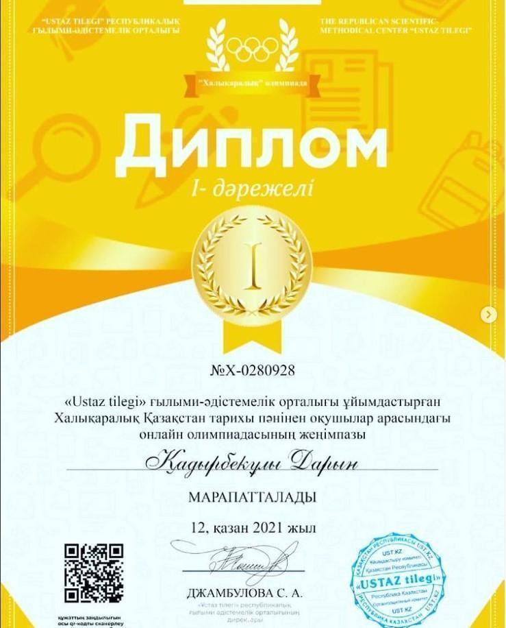 Республикалық Қазақстан тарихы пәнінен оқyшылар арасындағы онлайн олимпиадасының жеңімпазы