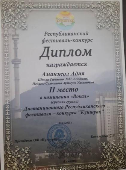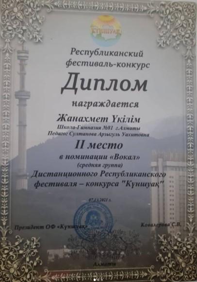Қашықтықтан ұйымдастырылған "Күн шуақ" республикалық фестиваль-байқауының "Вокал" жанрына қатысып, талантты әншілеріміз 7 "А" сынып оқушысы Салыбек Сая "ГРАН ПРИ"-ді, 3 "Ә" сынып оқушысы Бақытжан Семанұр мен 4 "Б" сынып оқушысы Ерік Айзере І орынды, 5 "А" сынып оқушысы Аманжол Адия мен 7 "А" сынып оқушысы Жанахмет Үкілім ІІ орынды иеленді. Оқушыларымызды жеңістерімен құттықтаймыз. Талаптарыңа нұр жаусын. Жетекшісі, музыка пәні мұғалімі: Султанова А.У