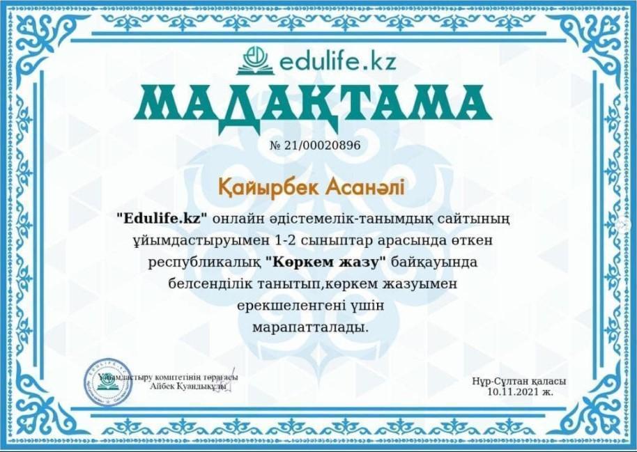 "Edulife.kz" онлайн әдістемелік-танымдық сайтының ұйымдастыруымен 1-2 сыныптар арасында өткен республикалық "Көркем жазу" байқауында белсенділік танытып, көркем жазумен ерекшеленгені үшін 1 "А" және 2 "Ә" сынып оқушылары марапатталды.