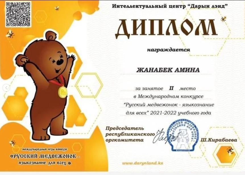 "Дарын лэнд" интеллектуалды орталығы ұйымдастырған халықаралық " Русский медвеженок - языкознание для всех" байқауына қатысып, І-ІІ орын иеленген оқушыларды жеңістерімен құттықтаймыз. Жарайсыздар !👍