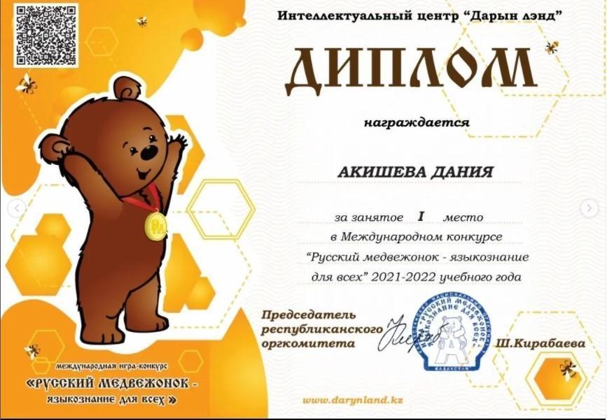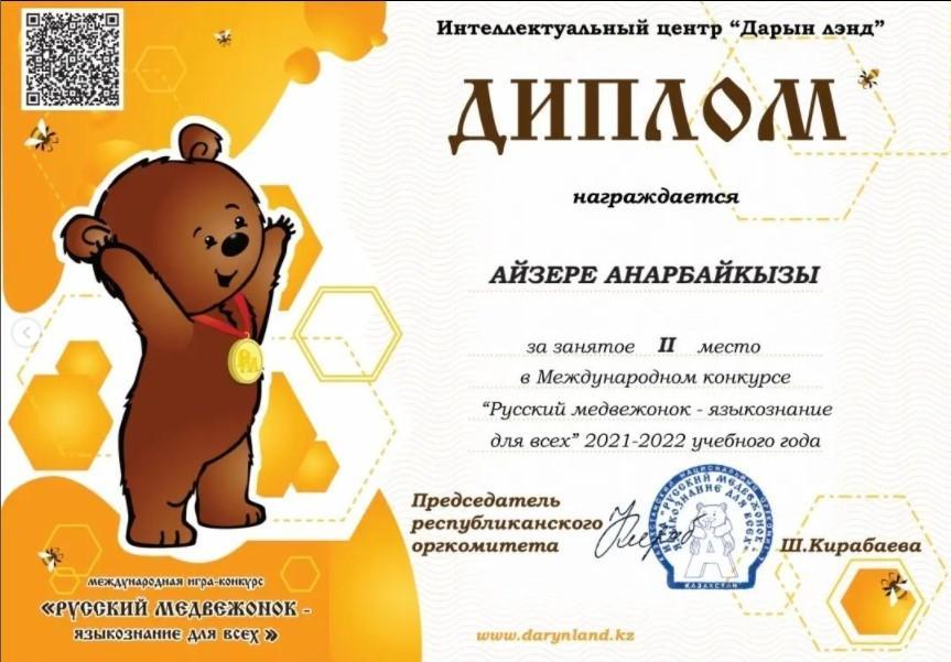 "Дарын лэнд" интеллектуалды орталығы ұйымдастырған халықаралық " Русский медвеженок - языкознание для всех" байқауына қатысып, І орын иеленген оқушыларды жеңістерімен құттықтаймыз. Жарайсыздар !👍