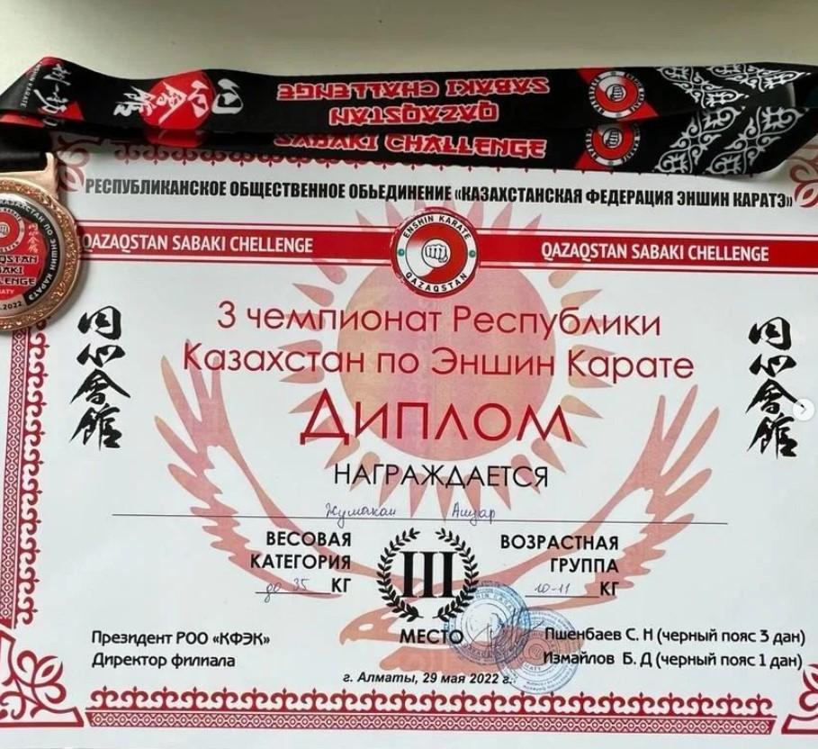 4 "А" сынып оқушысы Жумахан Ануар "Эншин каратэден" 3 республикалық чемпионатта ІІІ дәрежелі дипломмен марапатталды. Ануарды жеңісімен құттықтаймыз, алар асуың көп болсын!