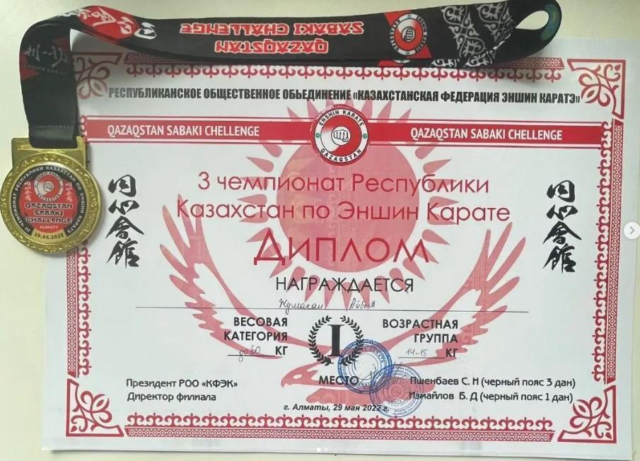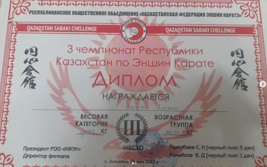 8:"А" сынып оқушысы Жумахан Айбын "Эншин каратэден" 3 республикалық чемпионатта І дәрежелі дипломмен марапатталды. Айбынды жеңісімен құттықтаймыз, әлем таныған спорт саңлағы бол!