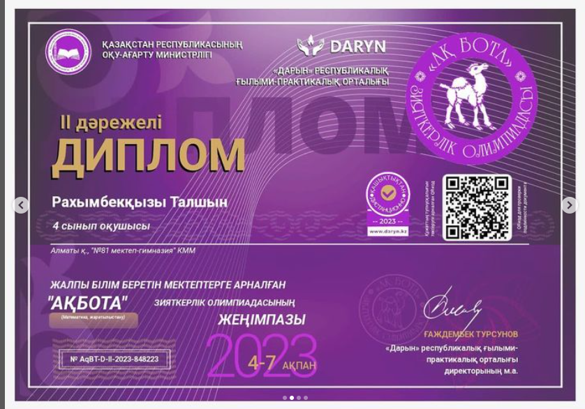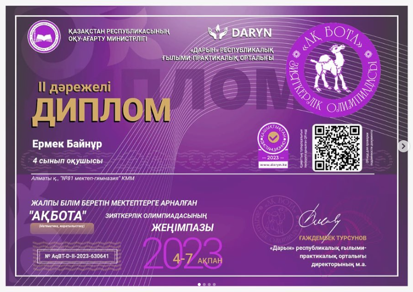 13 ақпан 2023 0 1 2 3 4 5 “АҚБОТА” зияткерлік олимпиадасының жеңімпаздары ДАРЫН” республикалық ғылыми-практикалық орталығы“АҚБОТА” зияткерлік олимпиадаға қатысып, жүлделі орын алған 4 «А» сыныбы жеңімпаздарын жеңістерімен құттықтаймыз! Жарайсыздар!👏👍🥇🏆Сынып жетекшісі:Женсикбаева А.С. Осы беттің QR-коды:QR-код этой страницы: