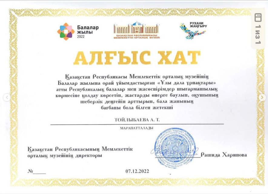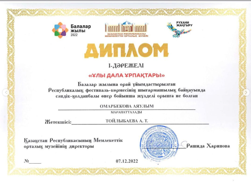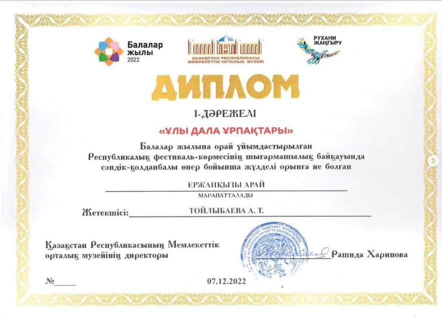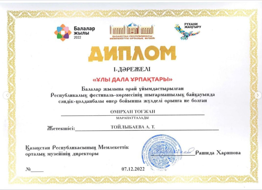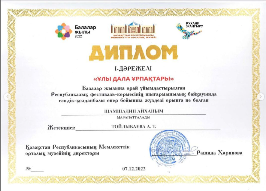 “Балалар жылына” орай ұйымдастырылған “Ұлы дала ұрпақтары” атты Республикалық фестиваль-көрмесінің шығармашылық байқауында сәндік-қолданбалы өнері бойынща жүлделі орын алған шәкірттерімізді құттықтаймыз. Керемет, жарайсыздар!